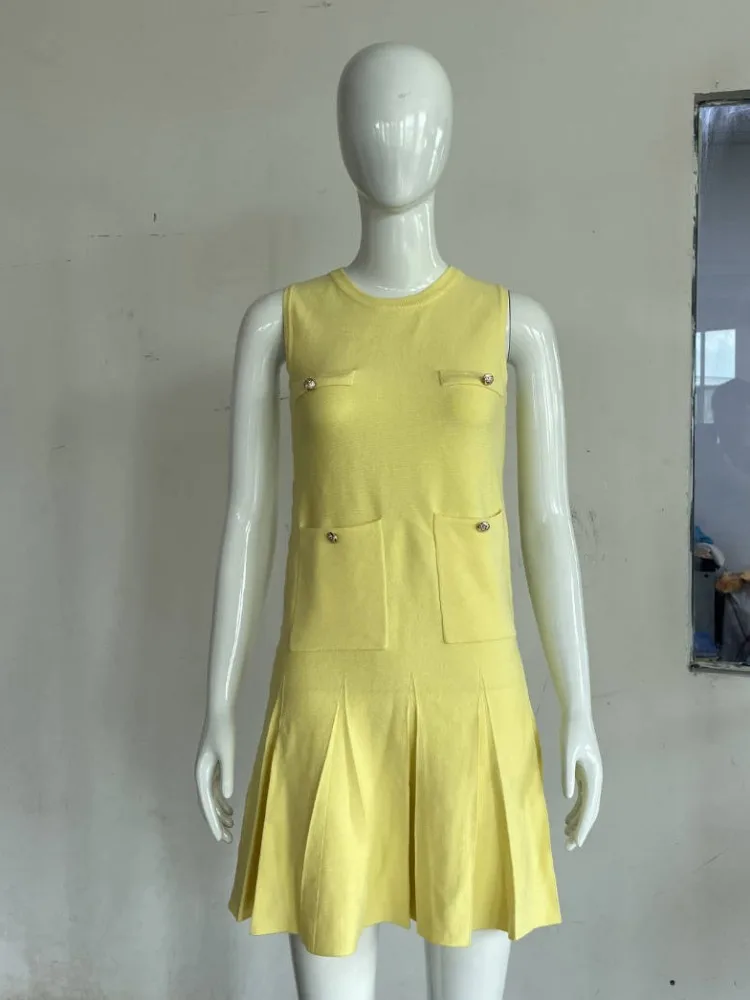 Elegant Yellow Pleated Sleeveless Mini Dress With Pockets – The Perfect Blend of Comfort and Style for Any Occasion