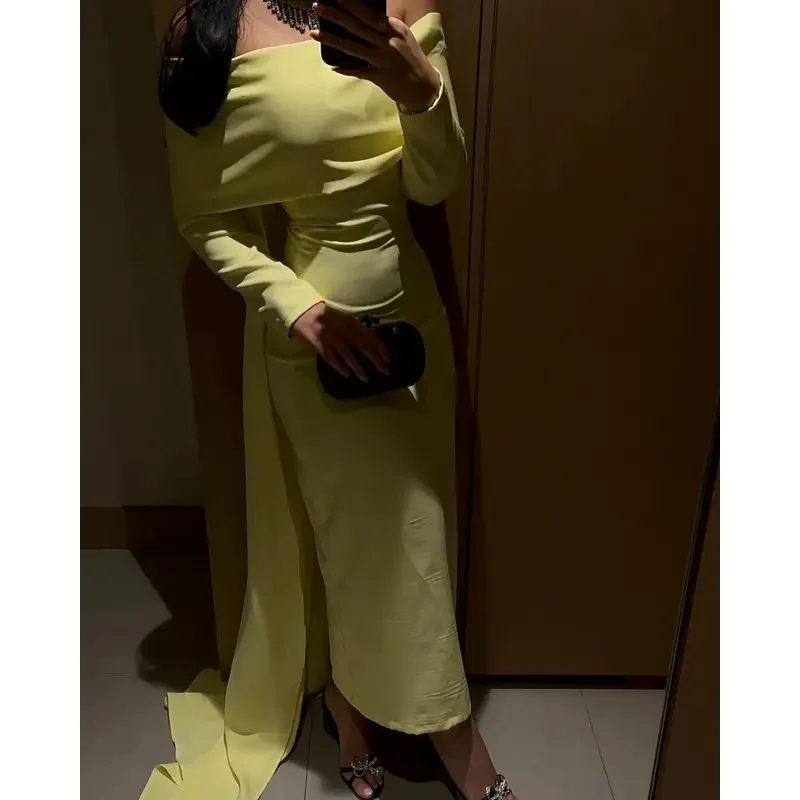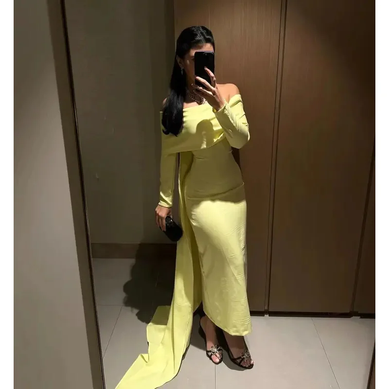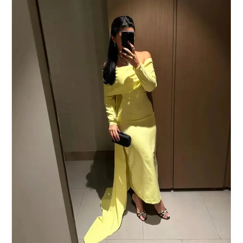 This dress combines simplicity and elegance with its off-shoulder neckline and ankle-length hem, making it a perfect choice for any formal event. The light yellow prom dress adds a soft, radiant glow, while the customized fit offers maximum comfort throughout the evening. This yellow prom dress is versatile enough for various occasions, ensuring that it will become a staple in your wardrobe for many events to come.