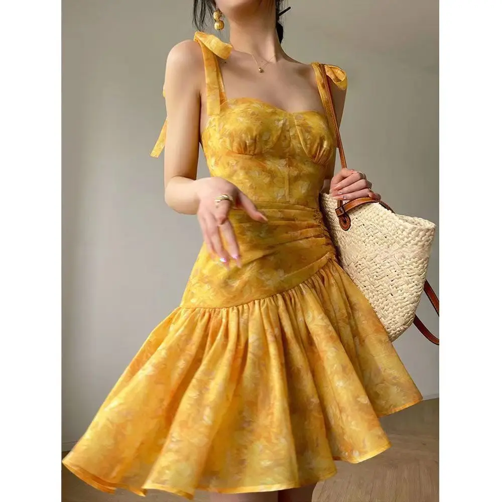 French Yellow Beaded Chiffon Spaghetti Strap Pleated Mini Dress for Women