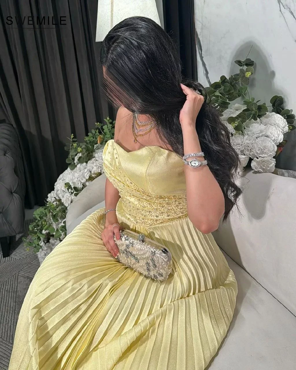 This yellow prom dresses features an A-line silhouette, strapless and sleeveless design, perfect for evening parties. Its elegant style and flattering fit make it an ideal choice for your special occasion.
