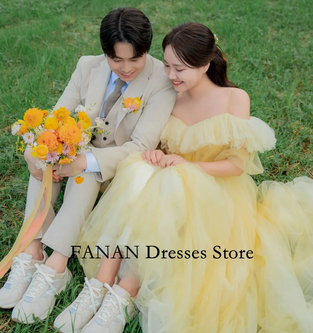 Yellow prom dresses: Customized tulle, spaghetti straps, ruffles, wedding gowns