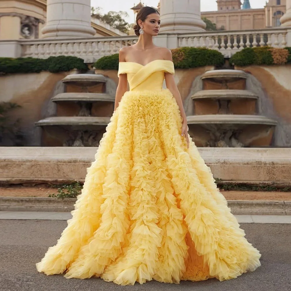 The Dreamy Yellow Tulle Ball Gown is the perfect choice for anyone searching for a yellow prom dress that is both elegant and show-stopping. Featuring a stunning off-shoulder neckline and delicate ruffled layers, this dress will make you feel like a princess. The tulle fabric creates a dreamy, ethereal effect, while the ball gown silhouette offers a timeless, full-bodied look. Available in light yellow prom dress options, this gown is ideal for those who want to turn heads at prom, weddings, or any special event. The built-in bra ensures comfort, while the train adds extra drama to your entrance.