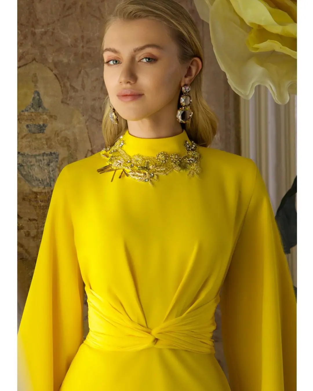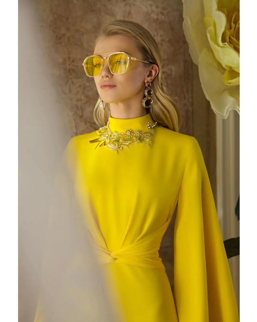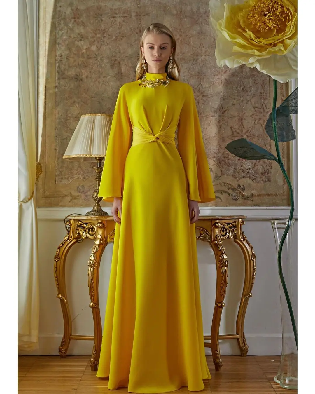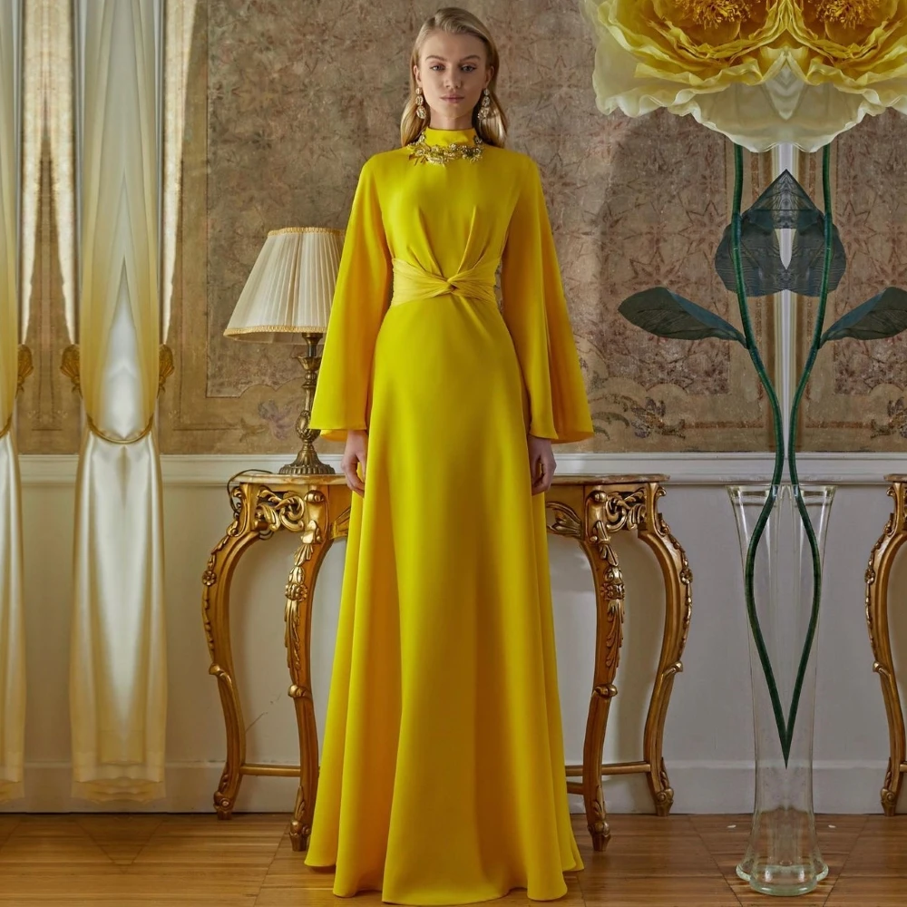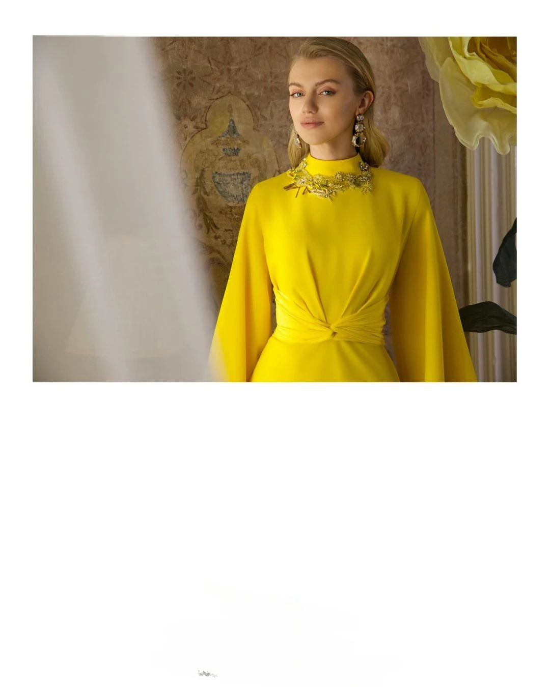 The Customized Prom Dress High Neckline Long Sleeve Yellow Ruched Formal Occasion Evening Gown is the ultimate choice for those seeking a yellow prom dress that radiates sophistication and class. With its high neckline, long sleeves, and ruched design, this dress offers a unique, timeless look. The floral appliqué and lace fabric make it ideal for women who want to stand out at any formal occasion or prom. Its customization options ensure a perfect fit tailored to your unique body shape, making it the perfect choice for a memorable evening.