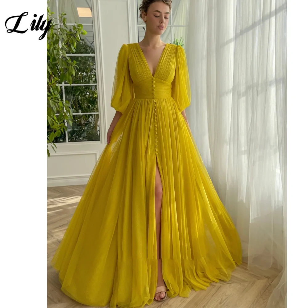 The Lily Yellow Deep V-neck Prom Dress is the ultimate choice for anyone seeking a yellow prom dress that blends elegance and modern style. Crafted from tulle, this gown features a flattering deep V-neck and three-quarter sleeves, creating a delicate yet dramatic look. The high split adds a touch of allure, while the backless design and sweep train provide a striking finish. The draped pleat decoration enhances the beach silhouette, making this light yellow prom dress perfect for a beach wedding or any formal event.