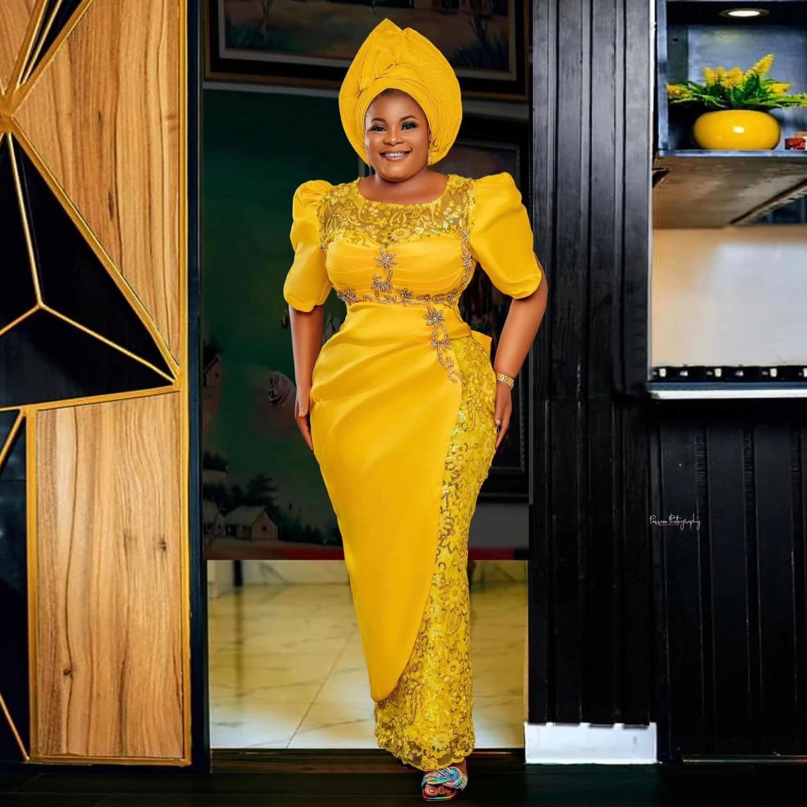 Stunning Nigerian gold yellow prom dresses with beaded lace details, ideal for African weddings, Asoebi events, and evening parties.