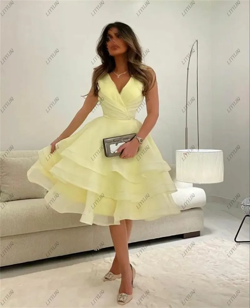 The Light Yellow Tea Length Prom Dress combines a vintage style with a modern twist, making it a versatile and elegant choice for various occasions. With a pleated tiered ruffle design, this yellow prom dress creates a dramatic yet sophisticated look. The backless style and V-neckline add a touch of allure, making it perfect for those seeking a balance of charm and modern style. Whether you’re attending a prom, cocktail party, or another special event, this light yellow prom dress will make you feel confident and stylish. The A-line silhouette ensures a flattering fit for all body types.