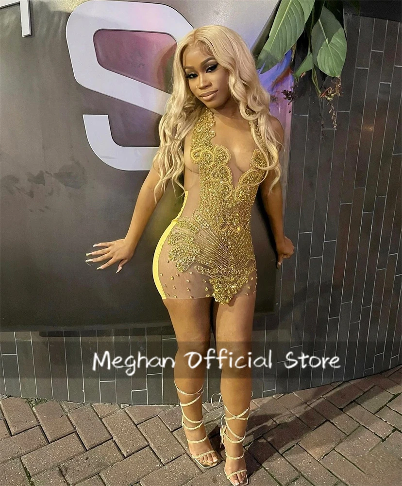 The Gold Halter Short Prom Dress is a stunning piece that brings the perfect amount of sparkle and sophistication to any formal event. With its beading, crystal rhinestones, and illusion style, this mini cocktail dress combines luxury with a modern twist. The halter neckline and mermaid silhouette flatter the body, while the natural waistline and sleeveless design create a timeless appeal.