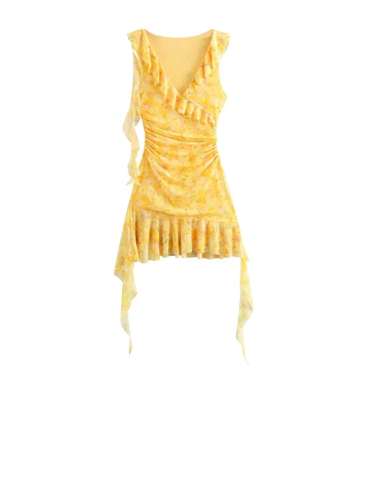 Yellow Ruffle Pleated Mini Dress Sleeveless Backless Holiday Party Wear