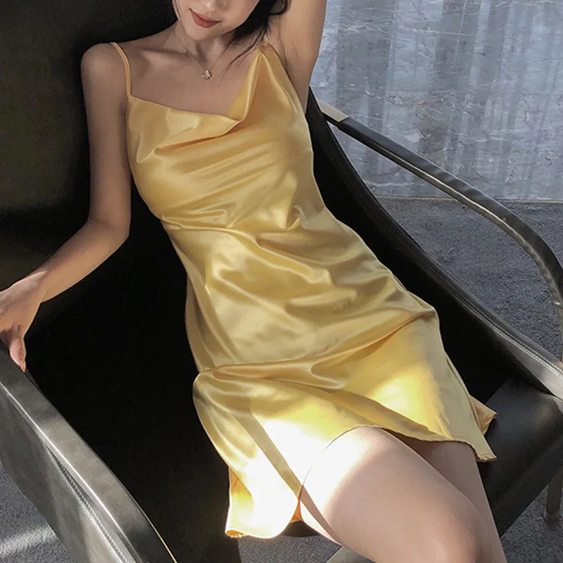 Yellow Spaghetti Strap Satin Mini Dress Summer Casual Sexy Dress