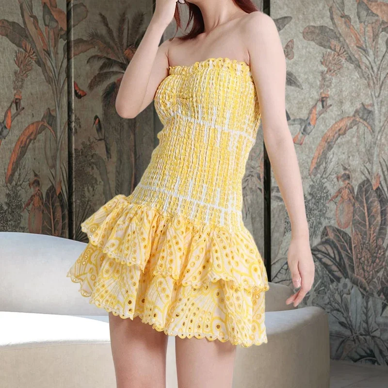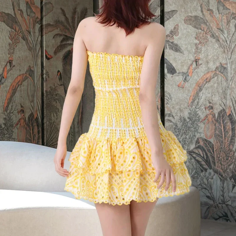 Yellow Strapless Embroidered Mini Dress For Women Summer Party